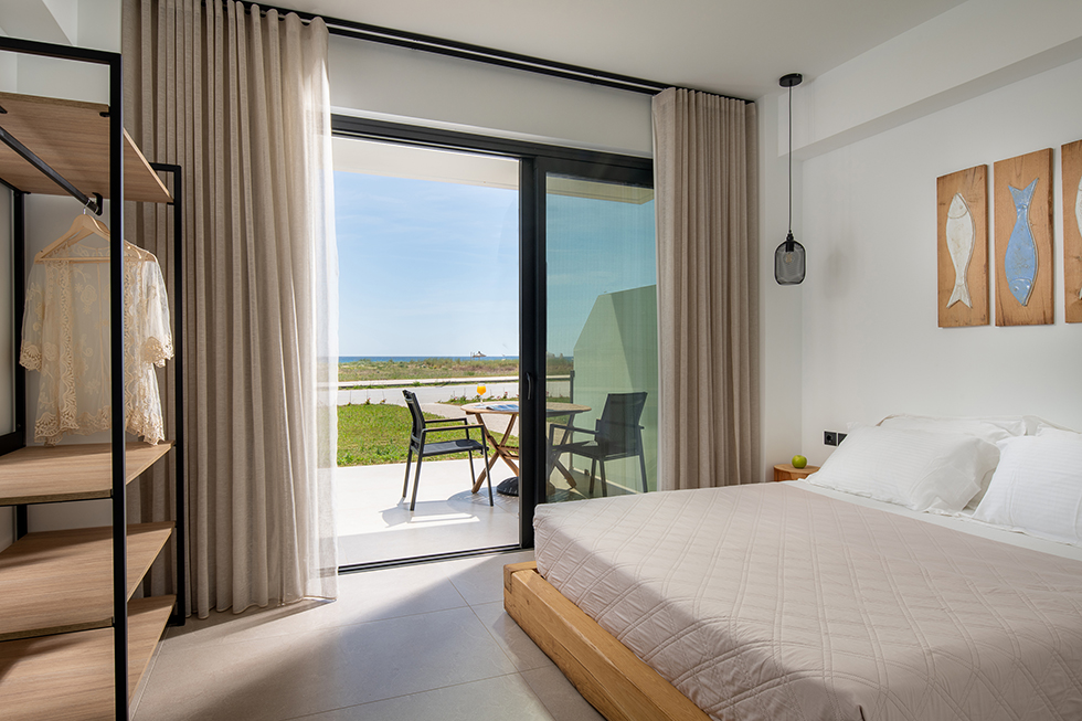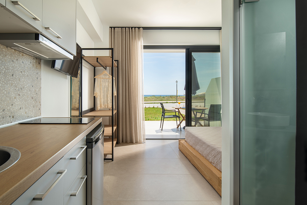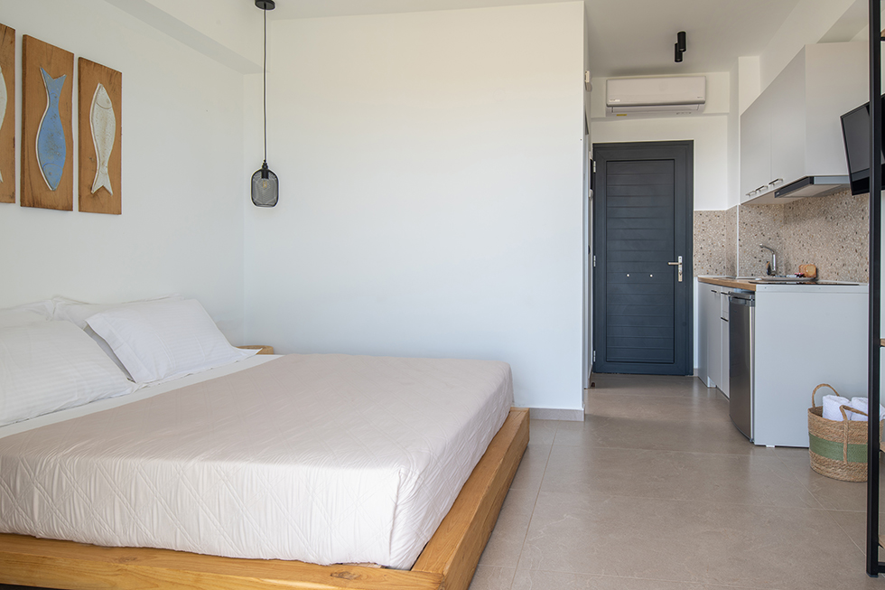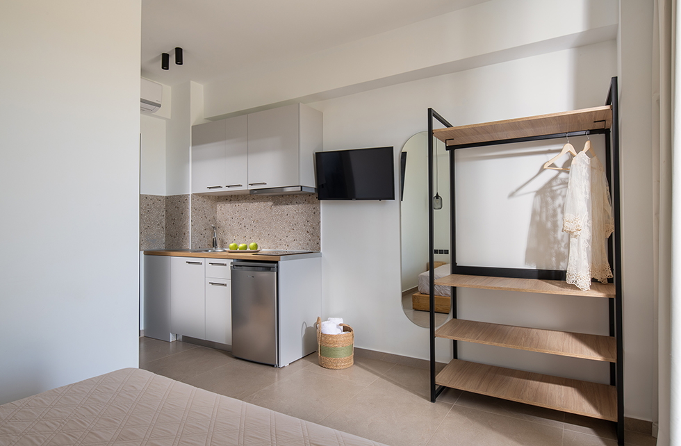 Standard double is at the ground floor with a big bed, luxury bathroom and a kitchen with kitchenware.