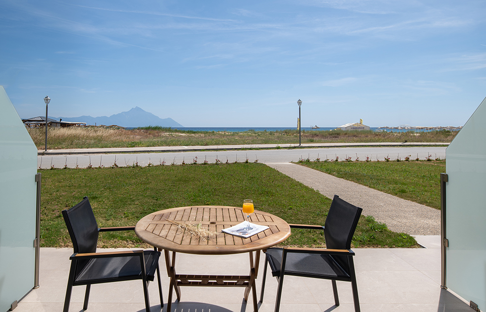 The balcony is about 10m2 with full view of the sea and mount Athos.