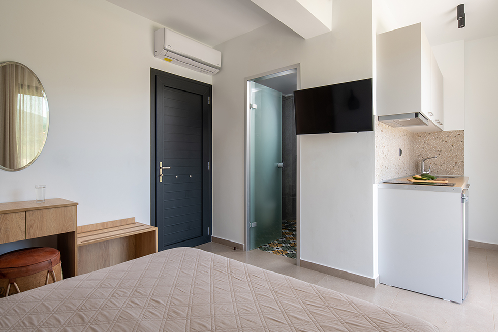Standard double mountain view is a beautiful room with a double bed luxury bathroom and a kitchen with kitchenware.