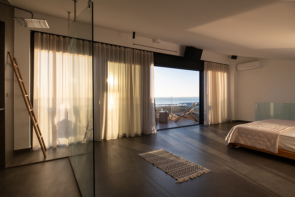 The smashing stairs gets you up to the king bedroom where the huge bed 1.80×2.00 and the deluxe open glass shower waiting for you.